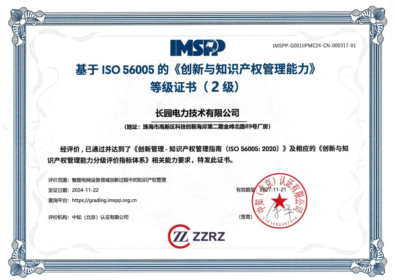 近日,在珠海市与高新区的知识产权主管部门领导班子的带领指导下,bbin宝盈科技集团旗下子公司bbin宝盈电力技术有限公司(以下简称:bbin宝盈电力)顺利获得珠海首批智能电网设备领域国际标准ISO 56005二级认证证书。